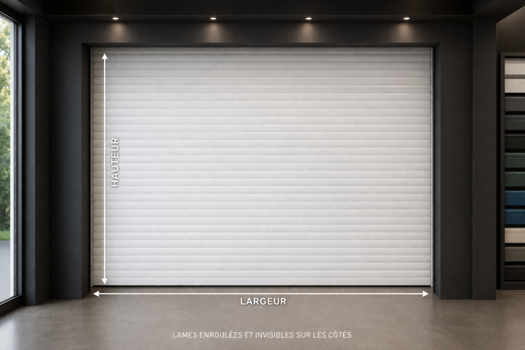 Le tablier s’enroule dans un coffre discret situé en partie haute, libérant entièrement l’espace intérieur du garage. Ce mécanisme vertical évite tout encombrement et s’adapte facilement à différentes configurations.